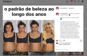 Na era da internet, além da família e dos amigos, nós temos os formadores de opinião nas redes sociais, os famosos “digitais influencers”. Ana Guimarães, de 17 anos, conta que mesmo que não se sinta mal com seu corpo, sempre que abre um story de alguma blogueira que ela segue e vê mais um procedimento estético que foi feito, acaba gerando um sentimento negativo nela. “Eu sempre fui magrinha, tenho dificuldade para ganhar peso e isso nunca me incomodou, mas no instagram todas são tão perfeitas, que eu acabo me perguntando: será que não tem algo de errado comigo?”