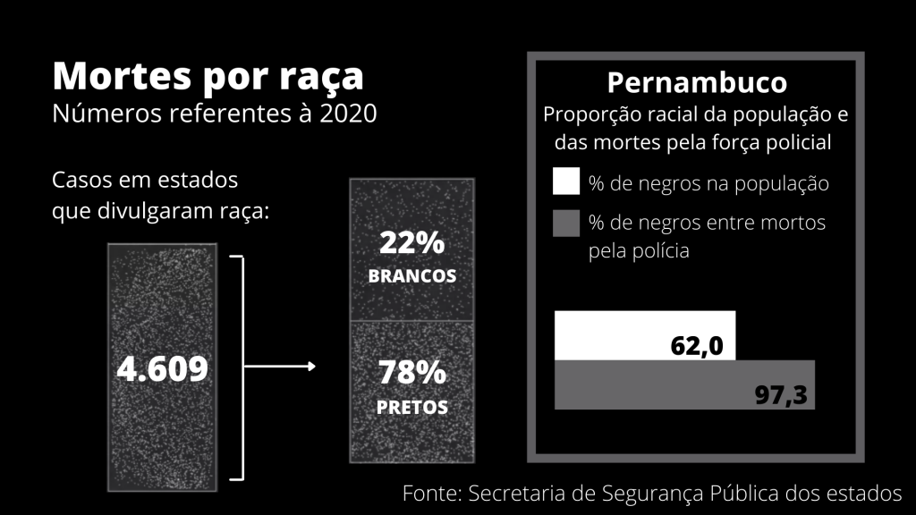 Segundo dados do Monitor de Violência, iniciativa do G1 em parceria com com o Fórum Brasileiro de Segurança Pública e o Núcleo de Estudos da Violência da USP, em 2020, no Brasil, 78% dos mortos pela polícia eram negros.