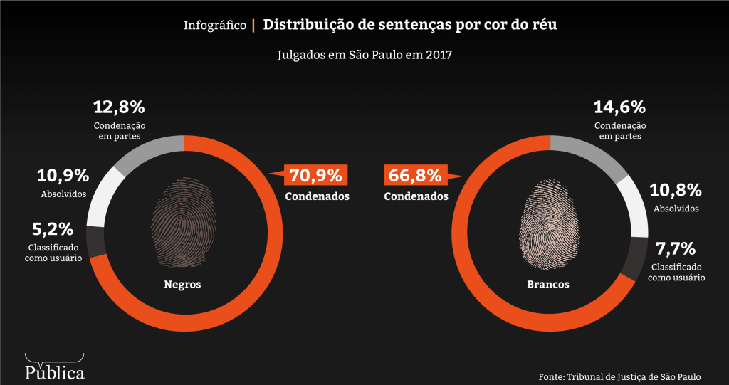 Dentre as formas contemporâneas de se instituir essa desigualdade social, que, na realidade brasileira, se traduz também em uma desigualdade racial, a proibição das drogas é um bom exemplo de como a democracia no Brasil é algo inventado. Um levantamento feito pela Pública, ao analisar mais de 4 mil sentenças de primeiro grau para o crime de tráfico de drogas julgados na cidade de São Paulo em 2017, revelou que pessoas negras são as mais condenadas por tráfico, com menores quantidades de drogas apreendidas.