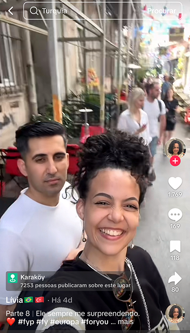 Livia, cearense que hoje vive na Turquia, foi uma das que compartilhou toda a trajetória com seu amado, incluindo o primeiro contato no aeroporto. O vídeo da brasileira acumula mais de 1.7 milhão de visualizações no TikTok, além de diversos comentários. Os comentários de outros usuários, idealizando o momento, trazem mensagens do tipo “queria ter essa coragem”, “que lindos” e questionamentos como “qual aplicativo você usou?” ou “o que acharam um do outro pessoalmente?”. Ela ainda publica com frequência sua rotina com a nova vida ao lado de seu amor e já acumula quase 30 mil seguidores na plataforma digital, que vem crescendo cada dia mais.